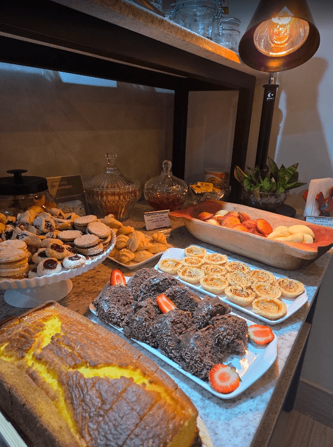 Nosso espaço Café com Arte nos faz viajar em um ambiente acolhedor e representado pelos biomas do nosso Estado. A nossa cultura e culinária cuiabana servem de inspiração para o nosso café da manhã.